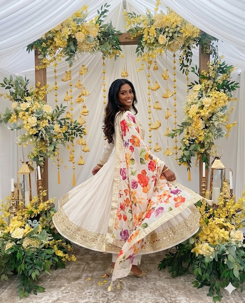Dupatta: A statement drape featuring a vibrant English floral print, finished with a gold zari border and delicate tassels.