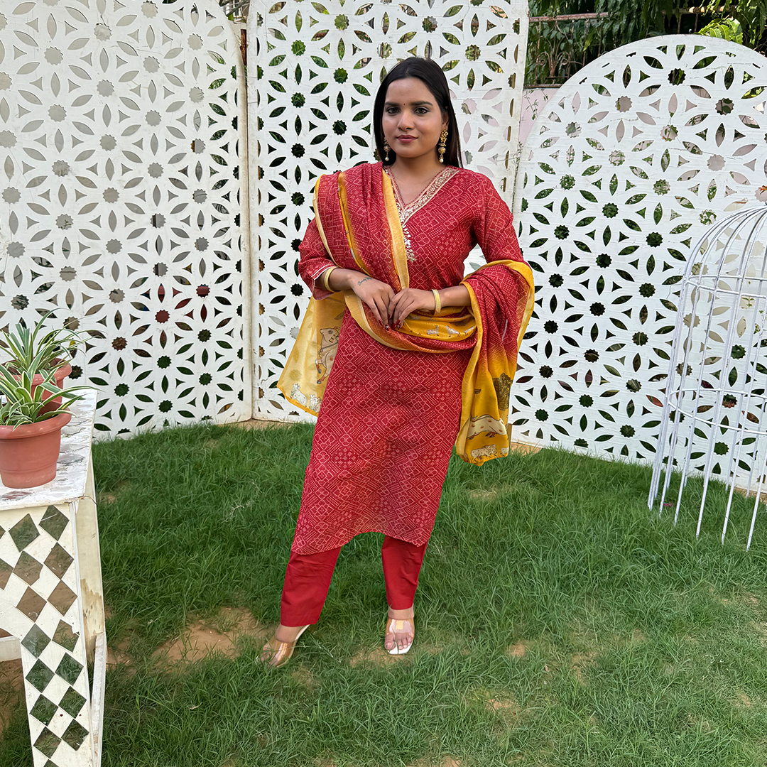 Honour tradition with this vibrant red ensemble, featuring a classic Bandhej print and spiritual artistry. Designed for comfort and grace, this straight-cut cotton set is a beautiful tribute to Indian heritage.