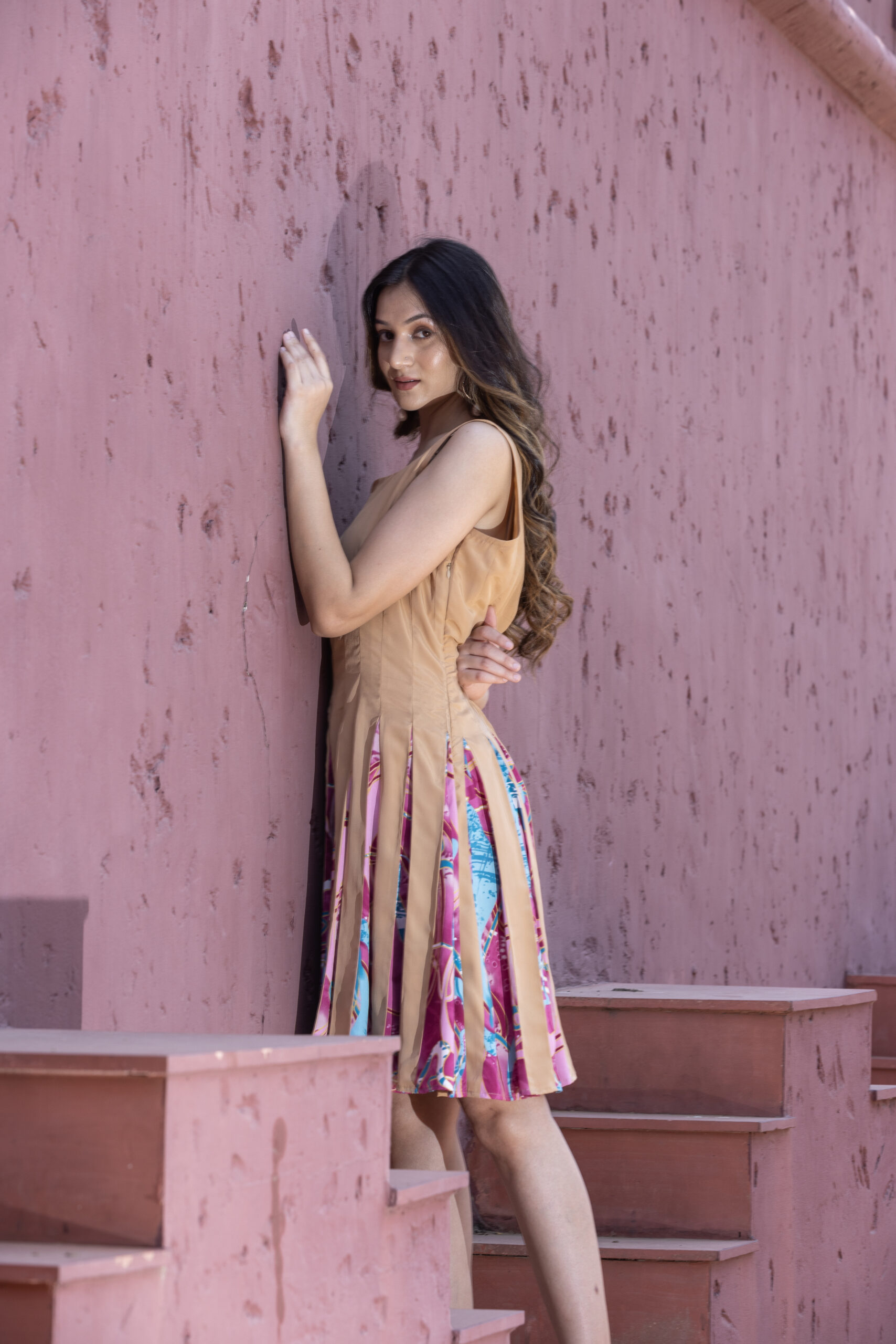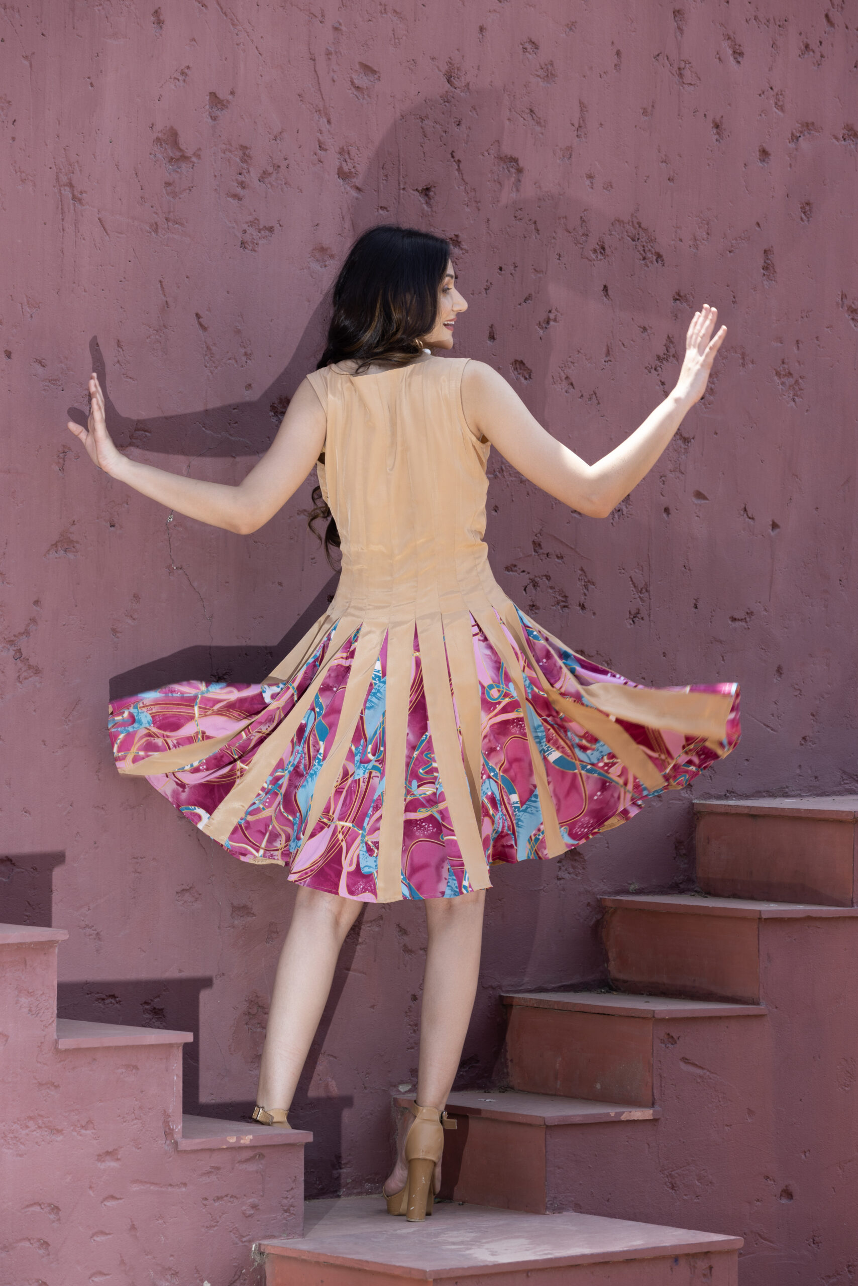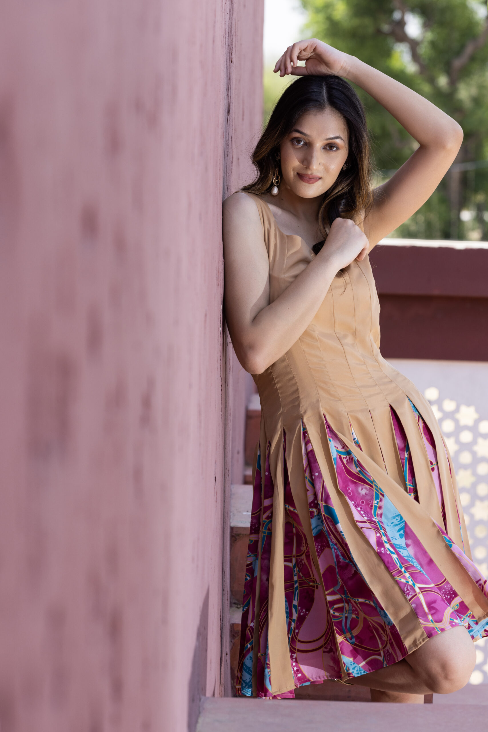 Detailing: Vertical beige panels contrast with the abstract print within the pleats for a multi-dimensional effect.